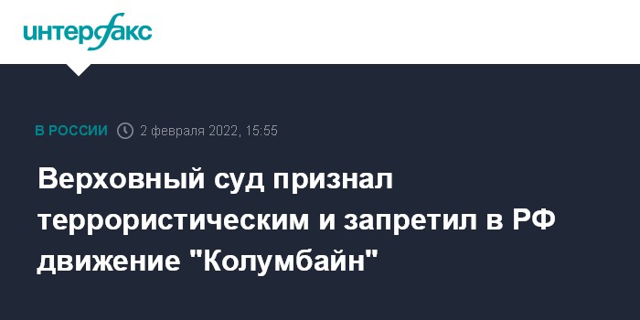 Москва. 2 февраля. INTERFAX.RU - Верховный суд РФ по иску Генпрокуратуры признал террористическим и запретил в России международное молодежное движение "Колумбайн" (другое название - "Скулшутинг").