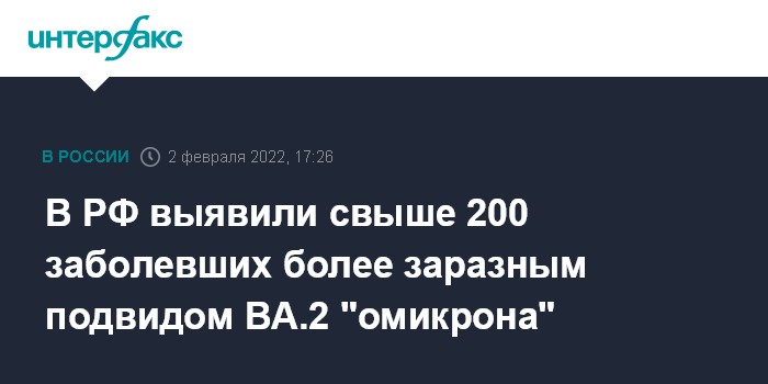 Москва. 2 февраля. INTERFAX.RU - В РФ зарегистрированы случаи заболевания линией BA.2 "омикрон"-штамма коронавируса, которая считается более заразной, чем распространенный вариант, сообщила глава Роспотребнадзора Анна Попова.