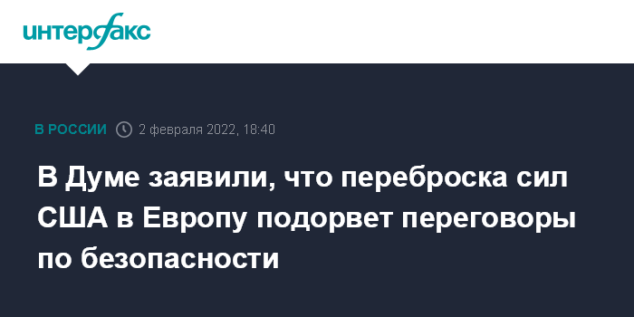 Москва. 2 февраля. INTERFAX.RU - Переброска контингентов США в Восточную Европу – деструктивный шаг, он может подорвать переговорный процесс по гарантиям безопасности и подтолкнуть Москву к жесткому ответу, заявил первый зампред комитета Госдумы по международным делам Дмитрий Новиков.
