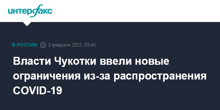 Москва. 3 февраля. INTERFAX.RU - Власти Чукотки ввели новые ограничения для борьбы с распространением коронавируса, запреты будут действовать до 28 февраля включительно, сообщила в четверг пресс-служба правительства округа.