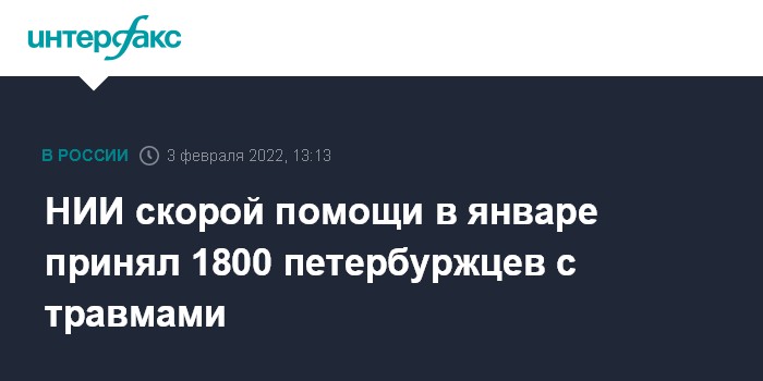 Москва. 3 февраля. INTERFAX.RU - В январе в Петербурге НИИ скорой помощи имени Джанелидзе принял в январе почти 1,8 тысячи человек с травмами, это почти не отличается от показателей предыдущих лет, рассказал на пресс-конференции заведующий отделом травматологии, ортопедии и вертебрологии института Игорь Беленький.