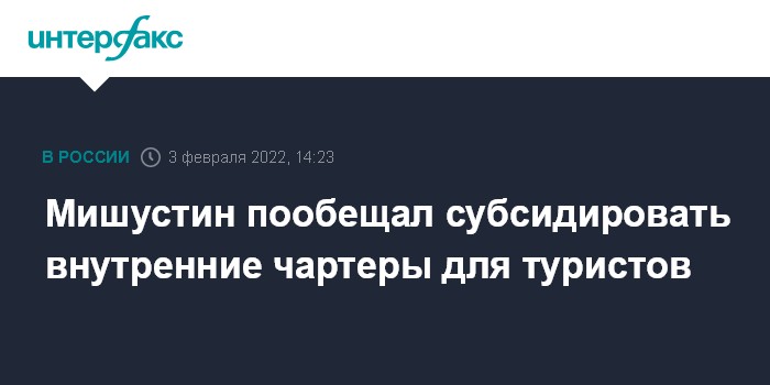 Москва. 3 февраля. INTERFAX.RU - Российские туроператоры в 2022 году снова получат субсидии на внутренние чартерные перевозки, это позволит туротрасли справляться с последствиями пандемии, сообщил на заседании правительства премьер-министр Михаил Мишустин.
