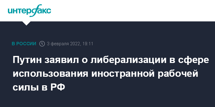 Москва. 3 февраля. INTERFAX.RU - Россия пойдет по пути либерализации использования иностранной рабочей силы, пообещал президент РФ Владимир Путин.