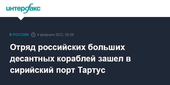 Москва. 4 февраля. INTERFAX.RU - Отряд из шести больших десантных кораблей Северного и Балтийского флотов зашел в сирийский порт Тартус в рамках учений, сообщили в Минобороны России.