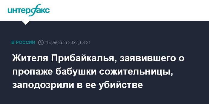 Москва. 4 февраля. INTERFAX.RU - Полицейские задержали жителя Иркутской области по подозрению в убийстве 81-летней бабушки его сожительницы, о пропаже которой он ранее заявил в полицию, сообщила в пятницу пресс-служба главного управления МВД по региону.