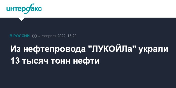 Москва. 4 февраля. INTERFAX.RU - В Коми полиция разыскивает двоих подозреваемых в хищении из нефтепровода "ЛУКОЙЛа" около 13 тысяч тонн нефти, сообщил информированный источник "Интерфакса". По его словам, нефть украли через врезку, которую сделали в трубе в 2016 году, а нашли эту врезку недавно.