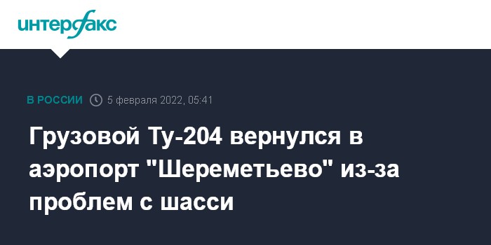 Москва. 5 февраля. INTERFAX.RU - Грузовой Ту-204, выполняющий рейс в интересах DHL, вернулся в "Шереметьево" из-за проблем с шасси, сообщил "Интерфаксу" информированный источник.