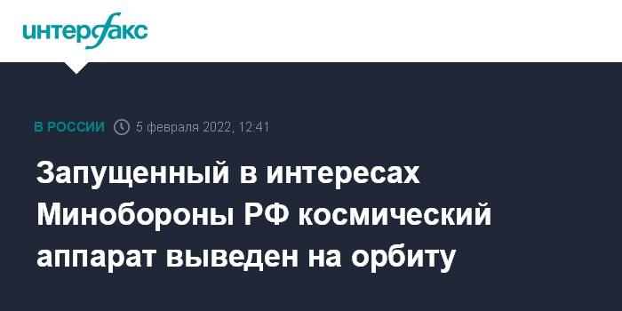 Москва. 5 февраля. INTERFAX.RU - Космический аппарат в интересах российского военного ведомства выведен на расчетную орбиту разгонным блоком "Фрегат", сообщил департамент информации и массовых коммуникаций Минобороны РФ.