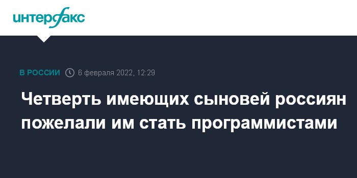 Москва. 6 февраля. INTERFAX.RU - Четверть россиян (26%), в семьях которых есть несовершеннолетние сыновья, желают, чтобы как минимум старший из них выбрал себе профессию в сфере IT-технологий, свидетельствуют данные опроса Исследовательского центра портала SuperJob.ru, поступившие в воскресенье в "Интерфакс".