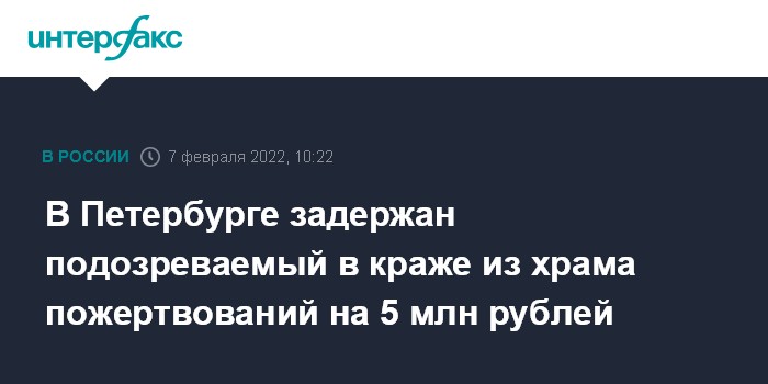 Москва. 7 февраля. INTERFAX.RU - Полиция Петербурга задержала подозреваемого в краже украшений и пожертвований из храма на несколько миллионов рублей, сообщила официальный представитель МВД России Ирина Волк.