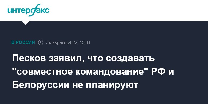 Москва. 7 февраля. INTERFAX.RU - Пресс-секретарь президента России Дмитрий Песков заявил, что ему неизвестно о планах создания объединенного командования союзных войск России и Белоруссии.