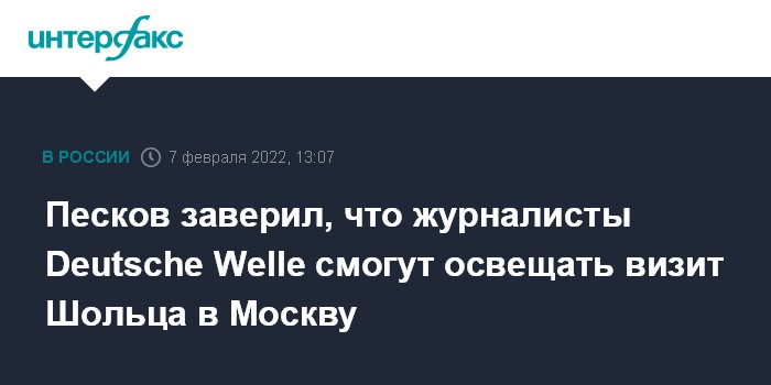 Москва. 7 февраля. INTERFAX.RU - Журналисты Deutsche Welle, которые приедут с канцлером Германии Олафом Шольцем для освещения его переговоров в Москве с президентом РФ Владимиром Путиным, смогут работать на этом мероприятии, заявил пресс-секретарь главы российского государства Дмитрий Песков.