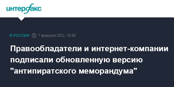 Меморандума о сотрудничестве в сфере охраны исключительных прав в эпоху развития цифровых технологий был заключен между правообладателями и компаниями "Яндекс", Mail.ru Group и Rambler 1 ноября 2018 года на фоне судебного разбирательства между телеканалами холдинга "Газпром-медиа" и "Яндексом" из-за ссылок на пиратский контент в сервисе "Яндекс.Видео". В соответствии с меморандумом, был создан реестр указателей страниц сайтов в интернете с пиратским контентом. Администраторы интернет-сервисов в течение шести часов должны исключать эти ссылки из поисковой выдачи в РФ. Участники меморандума: АО "Первый канал"; ФГУП "ВГТРК"; "СТС Медиа"; АО "Газпром-Медиа Холдинг; АО "Национальная Медиа Группа"; Ассоциация продюсеров кино и телевидения; Ассоциация "Интернет-видео"; ООО "Яндекс"; "Mail.ru Group"; ООО "СберИнтертеймент"; ООО "Рамблер Интернет Холдинг; ООО "ГПМ Партнер"; ООО "Руформ"; ООО "Кинопоиск"; Ассоциация анимационного кино.