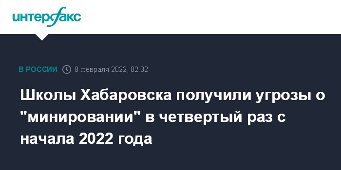 Москва. 8 февраля. INTERFAX.RU - Школы Хабаровска прервали учебный процесс из-за сообщений о "минировании" в четвертый раз с начала 2022 года, сообщает пресс-служба администрации города.