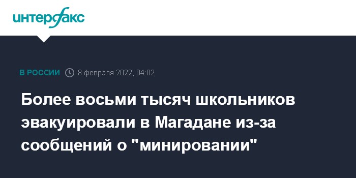 Москва. 8 февраля. INTERFAX.RU - Всех школьников Магадана во вторник утром эвакуировали из-за сообщений о "минировании", сообщили "Интерфаксу" в департаменте образования города.