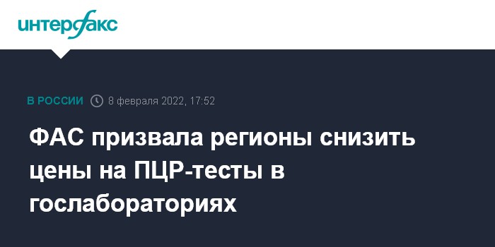 Москва. 8 февраля. INTERFAX.RU - Федеральная антимонопольная служба (ФАС) по итогам проверки обоснованности цен на ПЦР-тесты рекомендовала властям российских регионов снизить их в государственных лабораториях до среднего норматива затрат по базовой программе обязательного медицинского страхования (ОМС), сообщила во вторник пресс-служба ведомства.