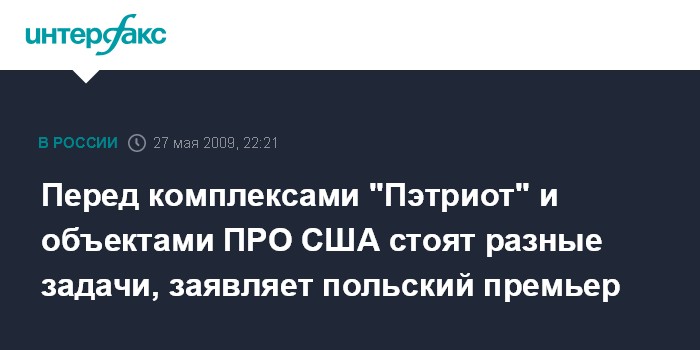 Варшава. 27 мая. ИНТЕРФАКС - Американские комплексы "Пэтриот" призваны укрепить воздушную безопасность Польши, а размещение на ее территории базы для перехватчиков в рамках системы ПРО США зависит только от Вашингтона, заявил премьер-министр Польши Дональд Туск.