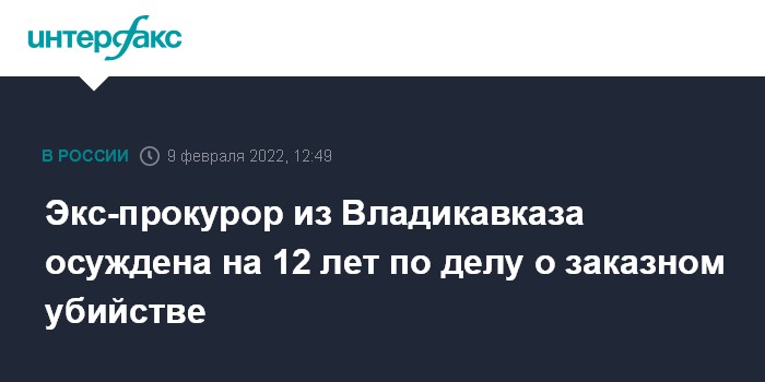 Москва. 9 февраля. INTERFAX.RU - Мосгорсуд приговорил бывшего прокурора одного из районов Владикавказа Ольгу Швецову к 12 годам колонии общего режима по делу об убийстве следователя - бывшего мужа ее сестры, сообщили в среду "Интерфаксу" в пресс-службе суда.