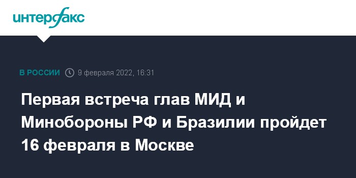 Первая встреча глав МИД и Минобороны РФ и Бразилии пройдет 16 февраля в Москве