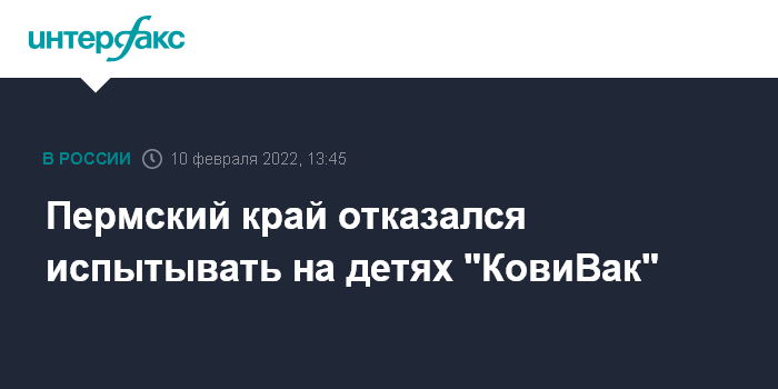 Москва. 10 февраля. INTERFAX.RU - Детская поликлиника в Перми, где должны были проводить тестирование вакцины "КовиВак" на несовершеннолетних, отказалась участвовать в испытаниях, сообщили "Интерфаксу" в пресс-службе регионального Минздрава в четверг.