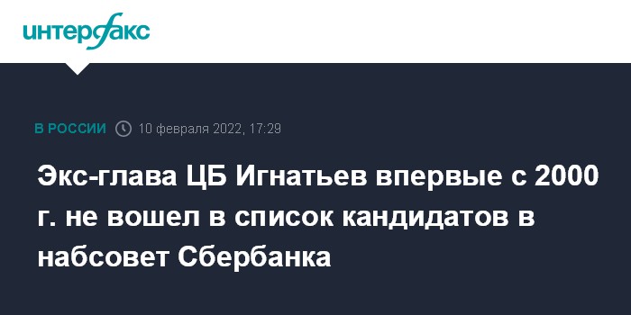 Экс-глава ЦБ Игнатьев впервые с 2000 г. не вошел в список кандидатов в набсовет Сбербанка