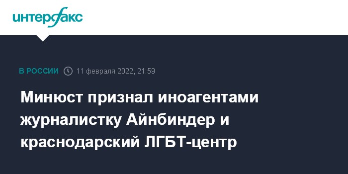 Москва. 11 февраля. INTERFAX.RU - Минюст внес в список иностранных агентов краснодарскую ЛГБТ-группу "Реверс" и журналистку Sota.Vision Александру Агееву (Айбиндер).