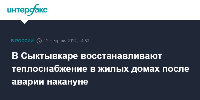 Москва. 12 февраля. INTERFAX.RU - Рабочие в Сыктывкаре заменили участок тепломагистрали, из-за повреждения которой накануне без теплоснабжения остались 35 многоквартирных домов, сообщила в субботу пресс-служба регионального филиала группы "Т Плюс".