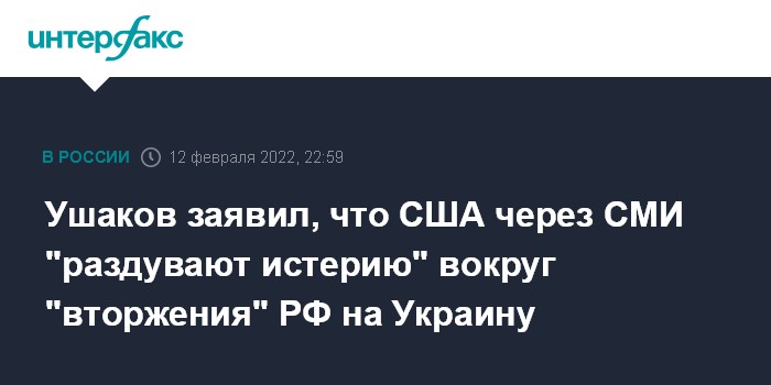Москва. 12 февраля. INTERFAX.RU - США искусственно нагнетают напряженность в связи с якобы планируемым российским вторжением на Украину, Россия не понимает, зачем американцы передают заведомо ложные данные об этом в СМИ, заявил помощник президента РФ Юрий Ушаков.
