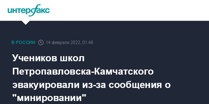 Москва. 14 февраля. INTERFAX.RU - Учеников и сотрудников всех школ в Петропавловске-Камчатском в понедельник эвакуировали после анонимного сообщения о "минировании", сообщает пресс-служба правительства Камчатского края.