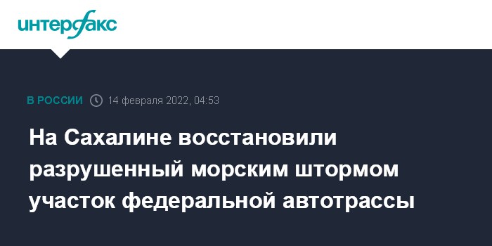 Москва. 14 февраля. INTERFAX.RU - Участок федеральной дороги возле села Взморье Долинского района на юге Сахалина, размытый 14 января волнами во время шторма в море, полностью восстановлен, сообщил в понедельник губернатор региона Валерий Лимаренко в своем телеграм-канале.