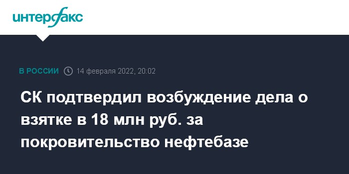 СК подтвердил возбуждение дела о взятке в 18 млн руб. за покровительство нефтебазе