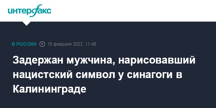 Москва. 15 февраля. INTERFAX.RU - Полицейские задержали мужчину, нарисовавшего запрещенную эмблему на входе в здание Еврейской религиозной общины в Калининграде, сообщили "Интерфаксу" в пресс-службе регионального УВД.