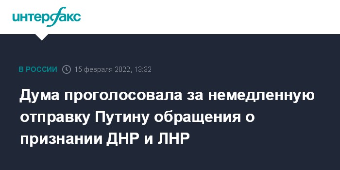 Москва. 15 февраля. INTERFAX.RU - Госдума на заседании во вторник приняла постановление о немедленном направлении президенту РФ обращения Думы о необходимости признания самопровозглашенных Донецкой и Луганской народных республик (ДНР и ЛНР).