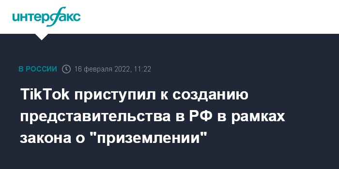 Москва. 16 февраля. INTERFAX.RU - Компания TikTok Pte. Ltd., зарегистрированная в Сингапуре, начала процесс создания представительства в России в рамках закона о "приземлении", сообщил директор по связям с органами власти (GR) в Восточной Европе TikTok Сергей Соколов.