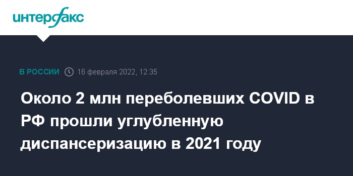 Москва. 16 февраля. INTERFAX.RU - В 2021 году углубленную диспансеризацию прошли 1,9 млн переболевших коронавирусом россиян, еще более 146 тысяч человек воспользовались услугой за прошедшие полтора месяца 2022 года, сообщил в среду замглавы Минздрава РФ Евгений Камкин.