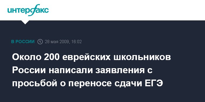 Москва. 28 мая. INTERFAX.RU - Заявления с просьбой о переносе ЕГЭ по русскому языку на 17 июня подали около 200 учащихся еврейских школ по всей России, сообщил в четверг порталу "Интерфакс-Религия" (www.interfax-religion.ru) пресс-секретарь главного раввина страны Андрей Глоцер.