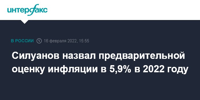 Москва. 16 февраля. INTERFAX.RU - Новая оценка Минэкономразвития по инфляции в 2022 году в 5,9% пока предварительная и не является официальным прогнозом, но отражает текущие реалии, сказал журналистам министр финансов Антон Силуанов.