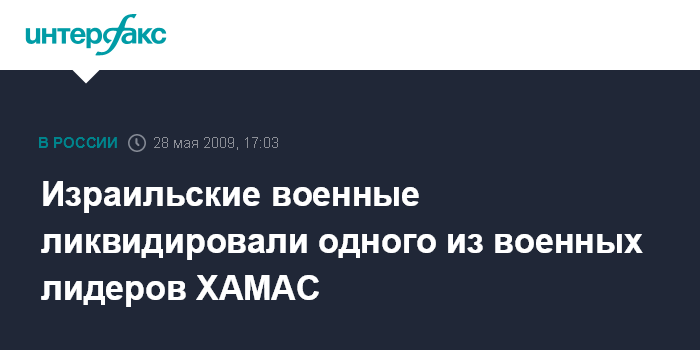 Москва. 28 мая. INTERFAX.RU - Израильский спецназ в четверг на Западном берегу уничтожил одного из членов руководства движения ХАМАС, отвечавшего за деятельность вооруженных подразделений в районе города Хеврон, сообщает интернет-сайт израильской газеты "Гаарец". По данным издания, спецназовцы в ходе спецоперации блокировали главу военного крыла ХАМАС на Западном берегу 45-летнего Абеда аль-Маджида Дудина в собственном доме и уничтожили его после того, как экстремист открыл по ним огонь.