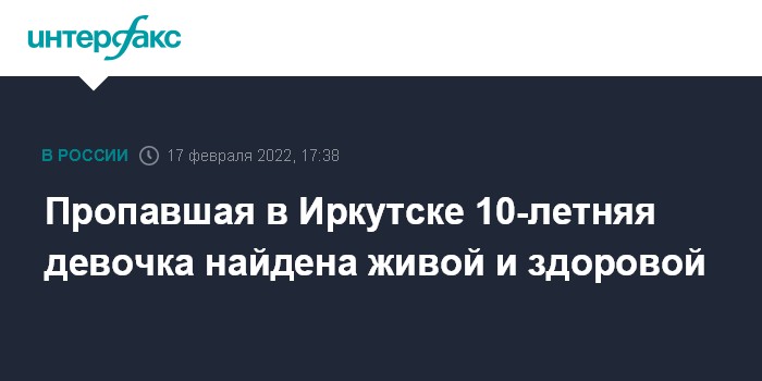Москва. 17 февраля. INTERFAX.RU - В Иркутске найдена девочка, которая в четверг днем ушла из магазина на улице Советской и не пришла домой.