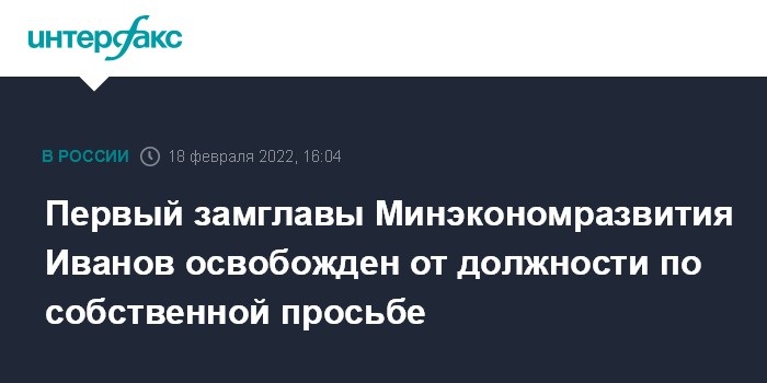 Москва. 18 февраля. INTERFAX.RU - Председатель правительства РФ Михаил Мишустин освободил Андрея Иванова от должности первого замглавы Минэкономразвития по его просьбе.