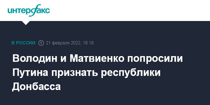 Володин и Матвиенко попросили Путина признать республики Донбасса