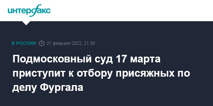 Москва. 21 февраля. INTERFAX.RU - Люберецкий городской суд 17 марта приступит к отбору присяжных по уголовному делу об убийствах в отношении бывшего губернатора Хабаровского края Сергея Фургала, сообщили "Интерфаксу" в суде.