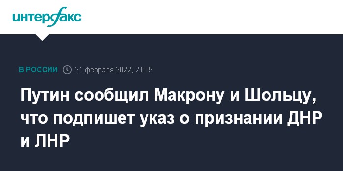 Путин сообщил Макрону и Шольцу, что подпишет указ о признании ДНР и ЛНР