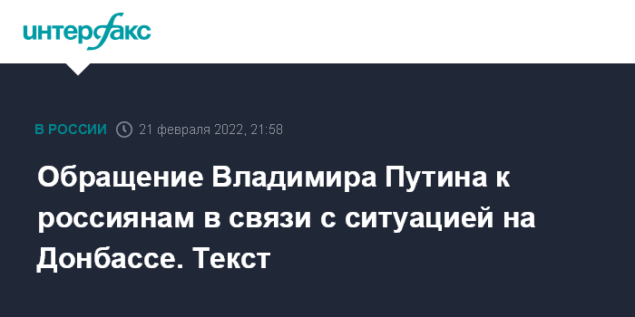 Обращение Владимира Путина к россиянам в связи с ситуацией на Донбассе. Текст