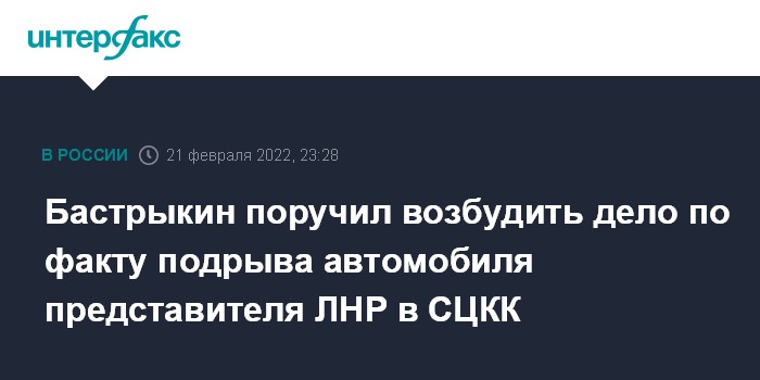 Москва. 21 февраля. INTERFAX.RU - Российские следователи расследуют попытку убийства руководителя представительства Луганской народной республики, получившего ранения в результате подрыва его автомобиля, сообщает сайт Следственного комитета РФ (СКР).