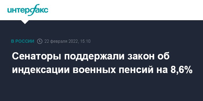 Москва. 22 февраля. INTERFAX.RU - Совет Федерации во вторник одобрил закон об индексации пенсий военным пенсионерам на 8,6% с 1 января 2022 года.