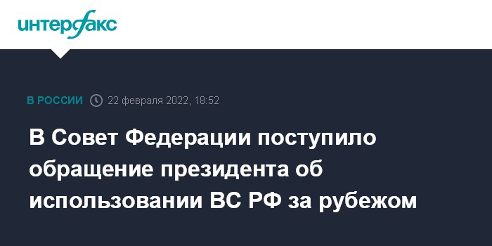 Москва. 22 февраля. INTERFAX.RU - Совет Федерации получил обращение президента РФ Владимира Путина об использовании российских военных за рубежом, сообщила спикер верхней палаты российского парламента Валентина Матвиенко.