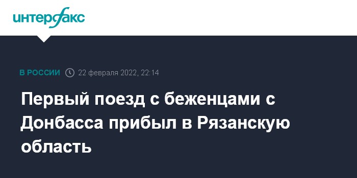 Москва. 22 февраля. INTERFAX.RU - В Рязанскую область прибыл первый пассажирский железнодорожный состав с эвакуированными жителями Донецкой и Луганской народных республик, сообщили "Интерфаксу" в региональном правительстве.