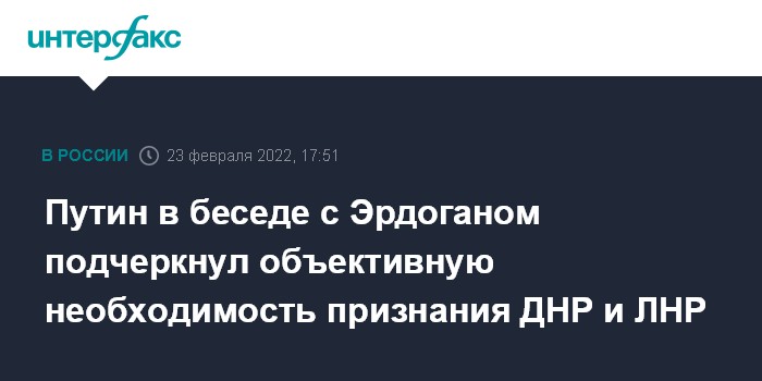 "Лидеры обменялись оценками ситуации в связи с признанием Россией Донецкой и Луганской народных республик. Владимиром Путиным была подчёркнута объективная необходимость принятого решения в условиях агрессии украинских властей в Донбассе и их категорического отказа выполнять Минские соглашения. Реджеп Тайип Эрдоган привел свои известные взгляды на этот счет", - отмечается в сообщении.