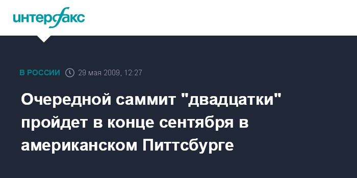 Москва. 29 мая. INTERFAX.RU - Следующий саммит "группы двадцати" пройдет 24-25 сентября в американском городе Питтсбурге, штат Пенсильвания, сообщают британские СМИ со ссылкой на заявление представителей Белого дома. Ранее предполагалось, что местом проведения следующего саммита "двадцатки" власти США объявят Нью-Йорк.